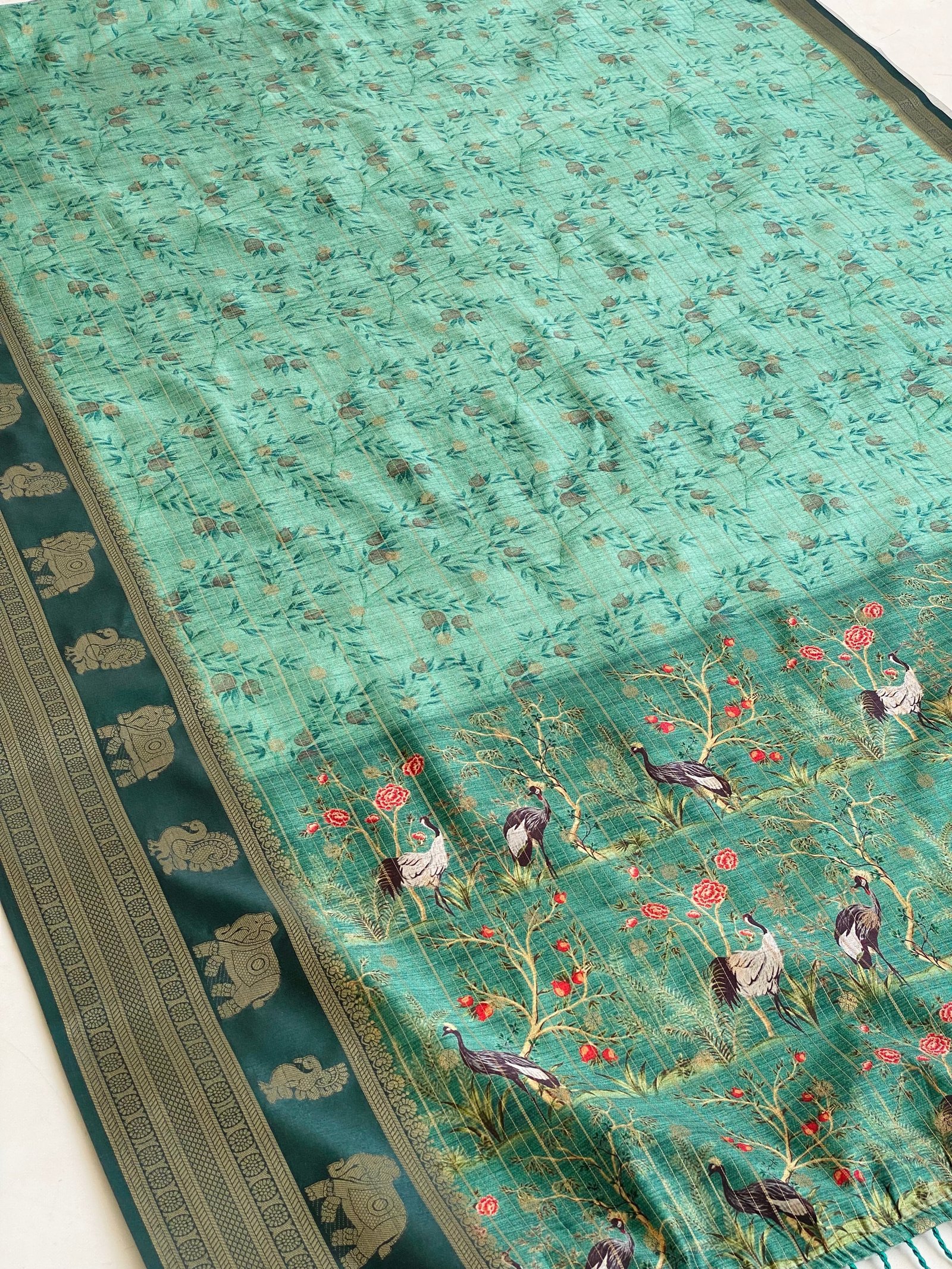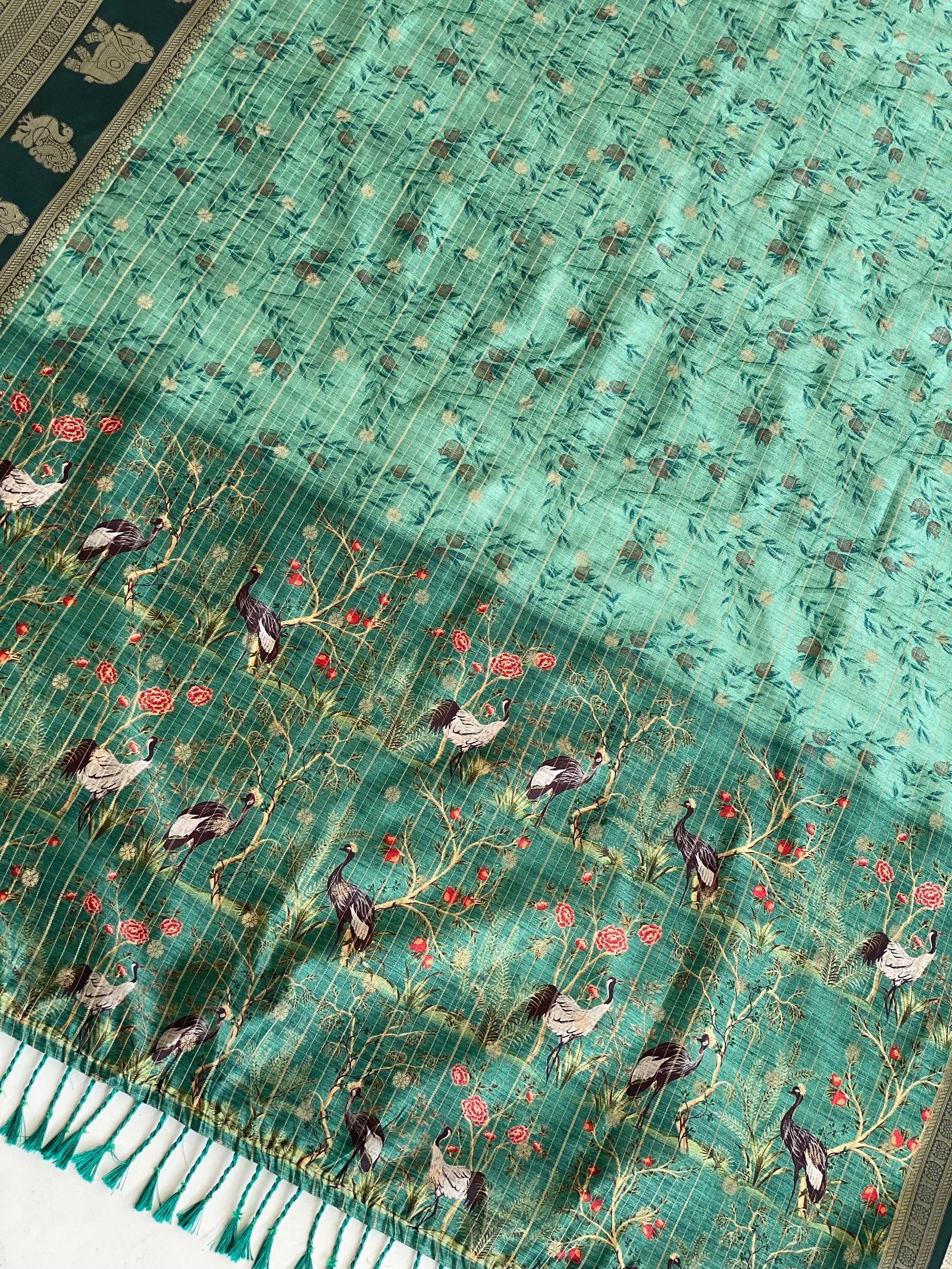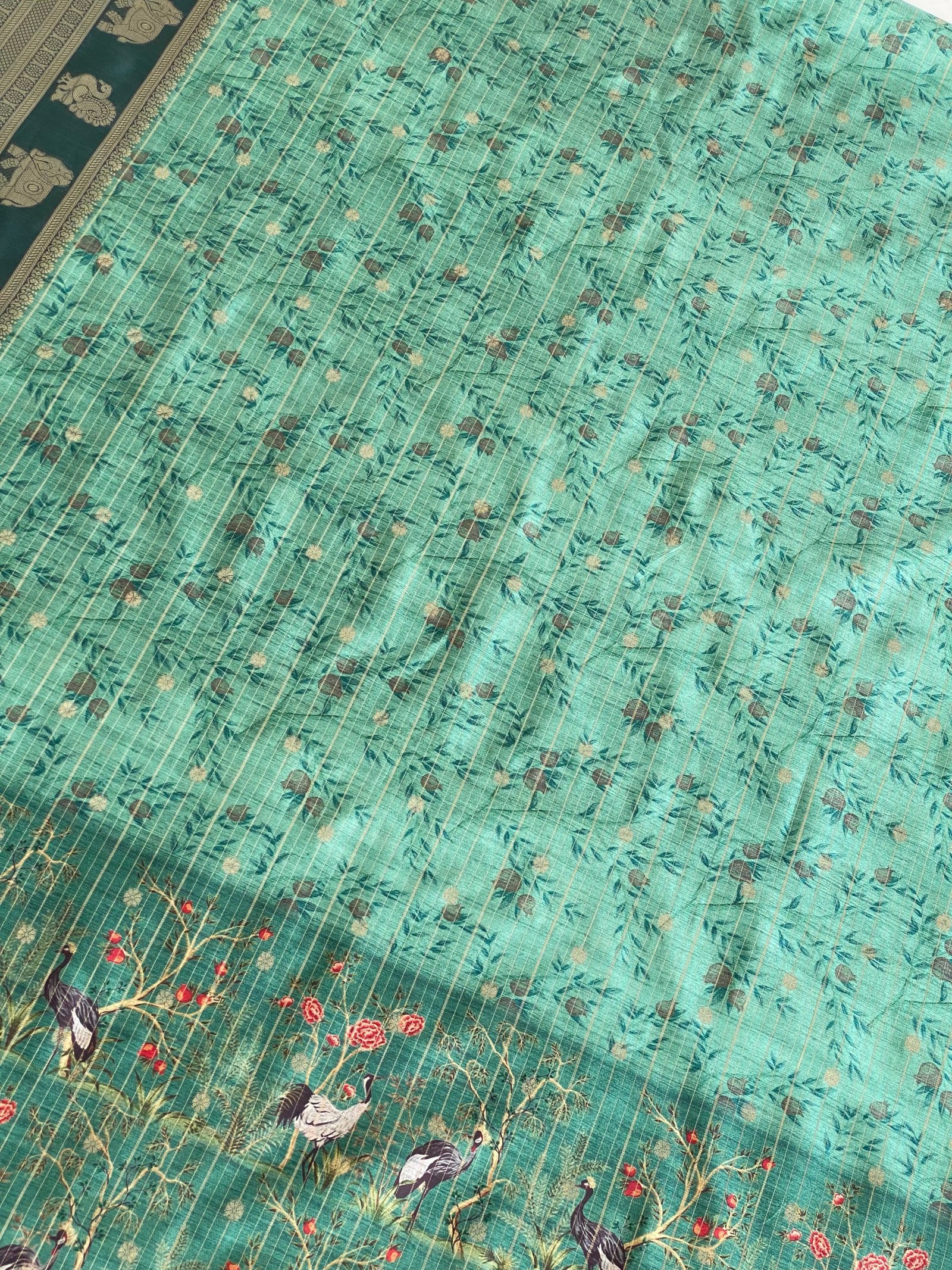 Celebrate the beauty of tradition with this stunning Semi-Tussar silk saree featuring exquisite Pichwai prints. The saree is adorned with intricate designs that depict cultural heritage and art. The zari border with checks adds a classic touch, while the fabric is soft, easy to drape, and provides a graceful fall. Perfect for festive occasions, cultural gatherings, or special celebrations, this saree combines timeless charm with modern comfort.
