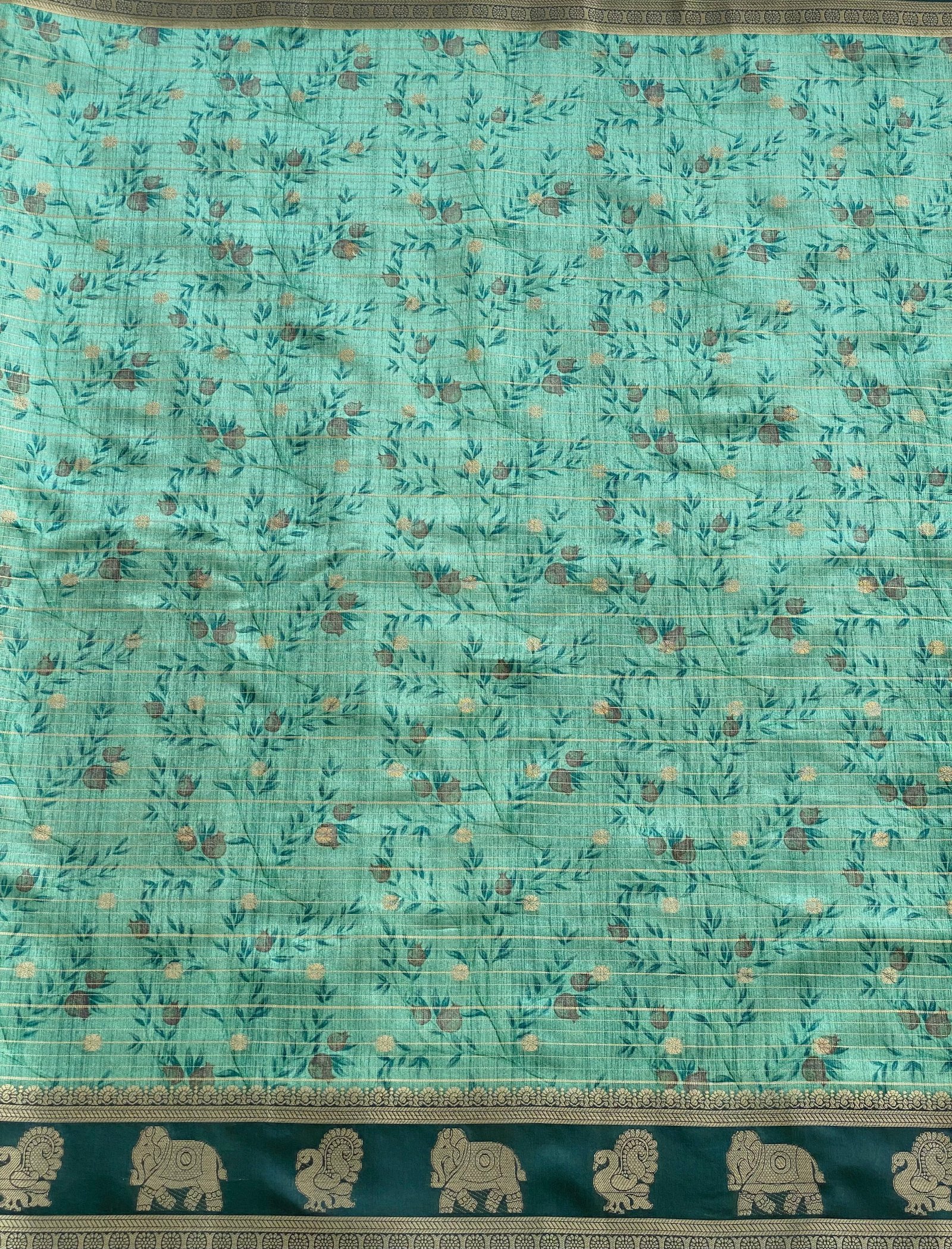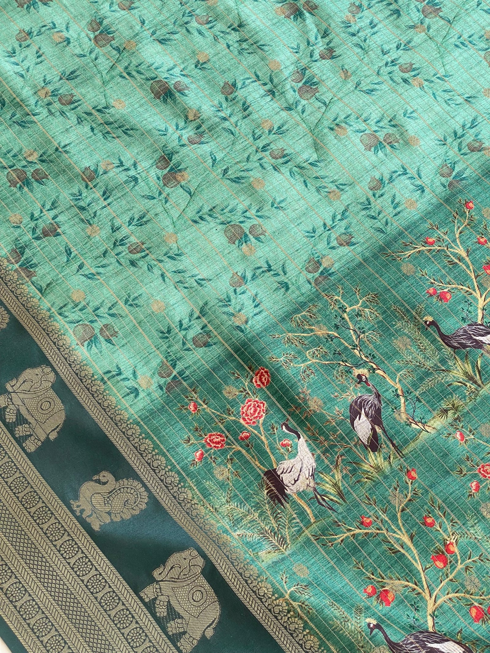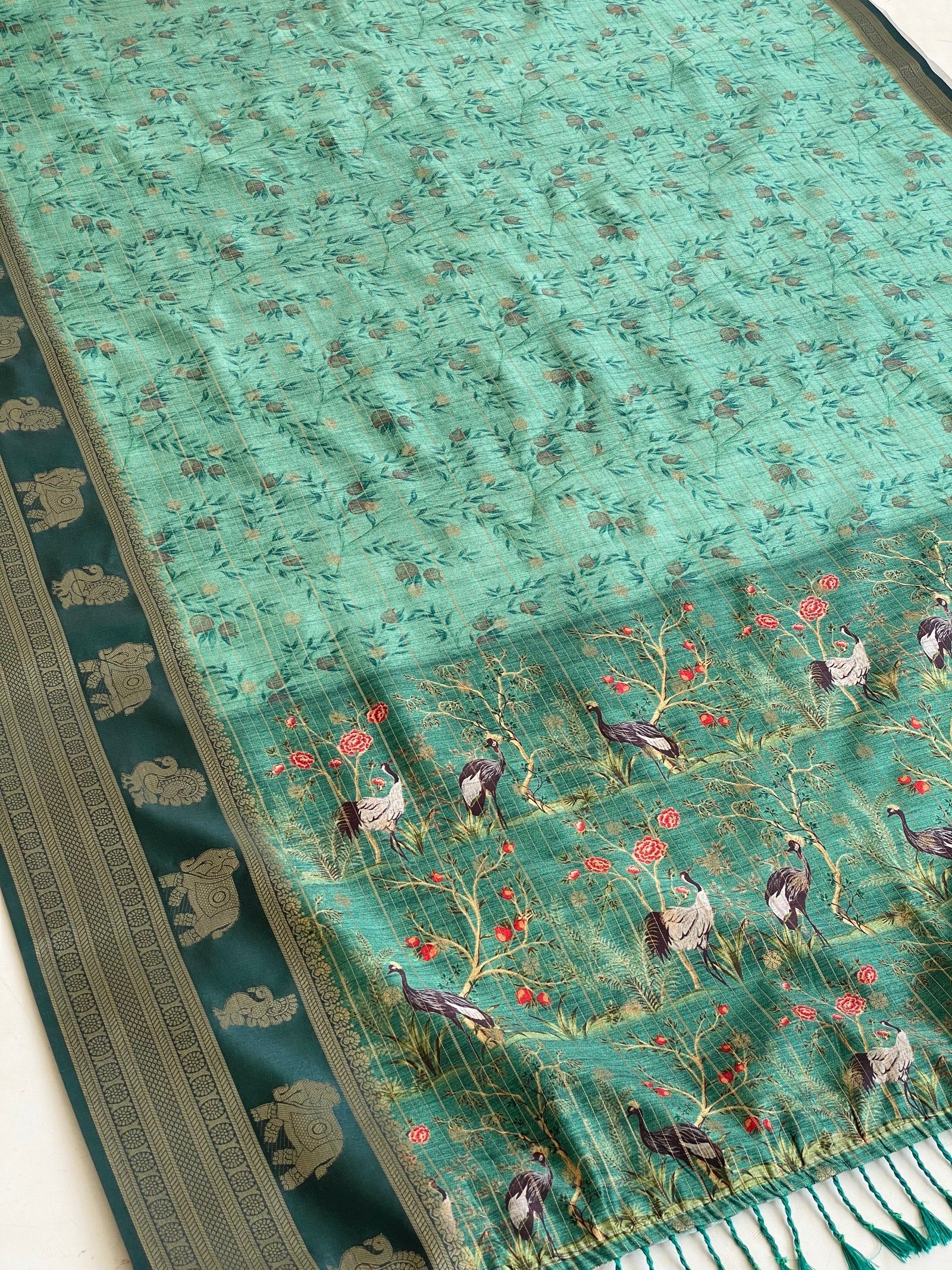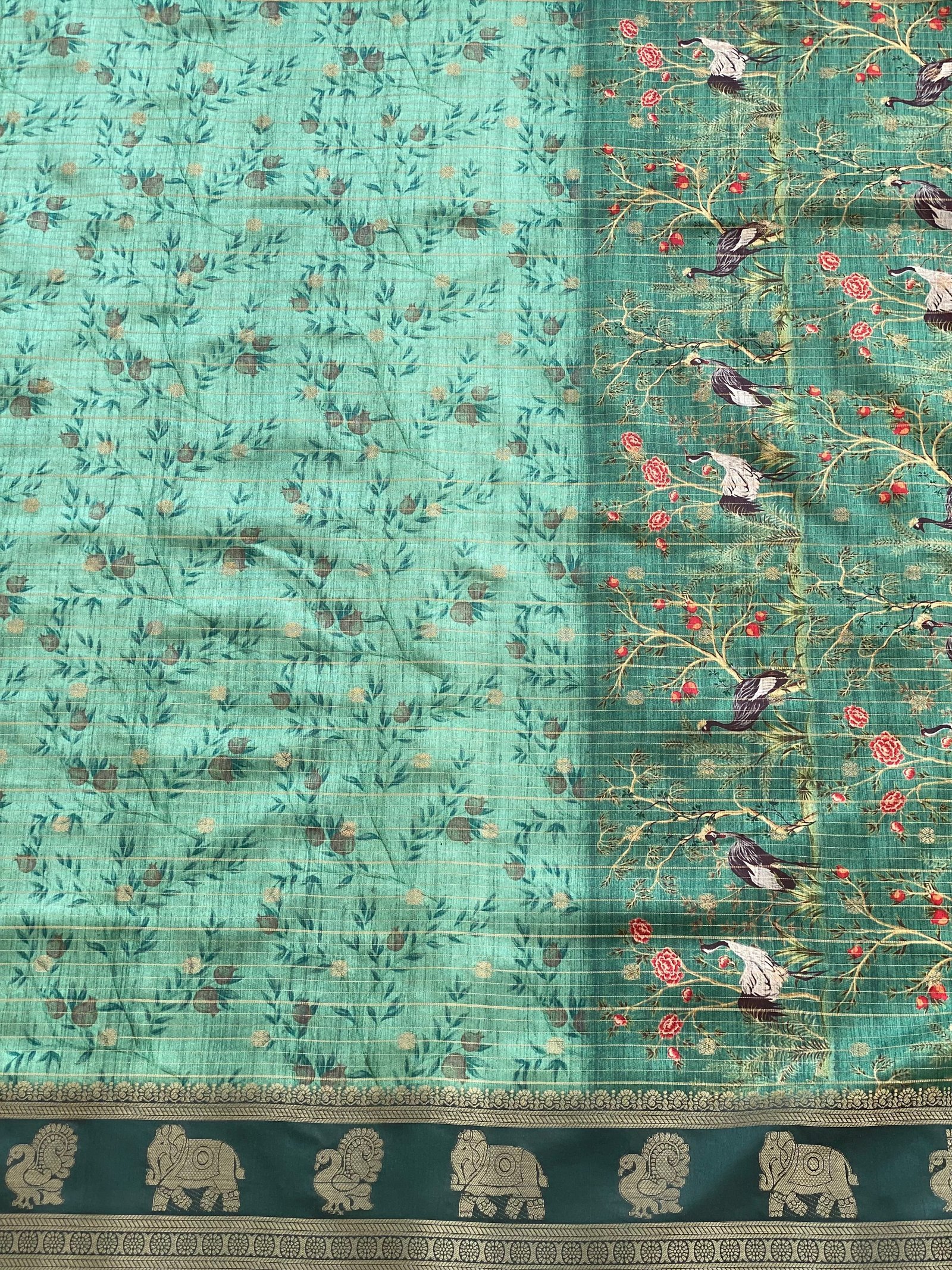 Celebrate the beauty of tradition with this stunning Semi-Tussar silk saree featuring exquisite Pichwai prints. The saree is adorned with intricate designs that depict cultural heritage and art. The zari border with checks adds a classic touch, while the fabric is soft, easy to drape, and provides a graceful fall. Perfect for festive occasions, cultural gatherings, or special celebrations, this saree combines timeless charm with modern comfort.