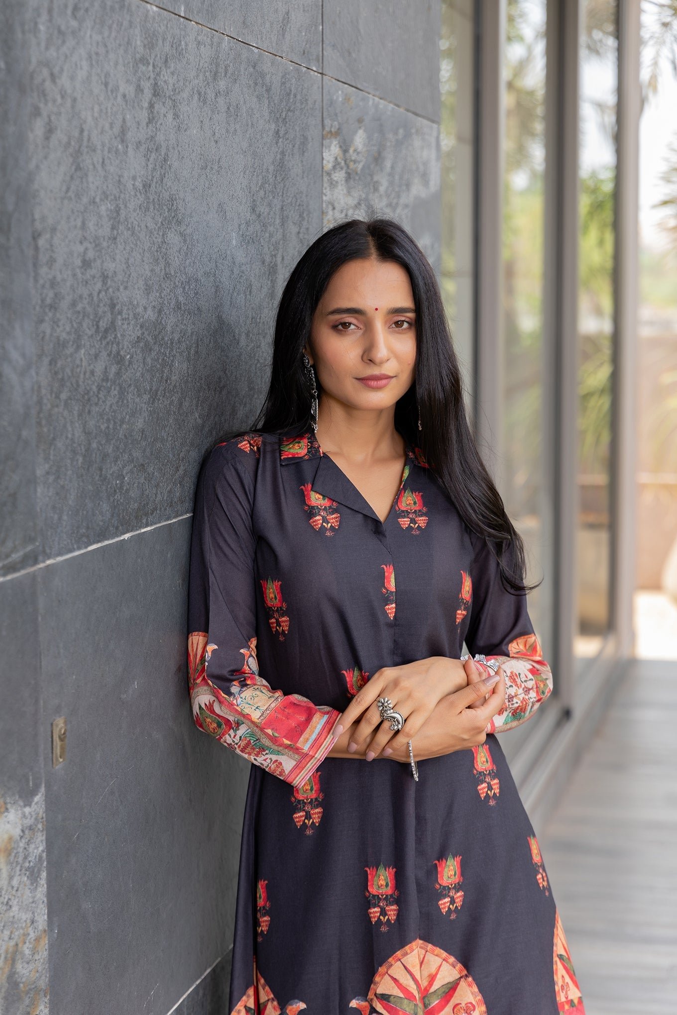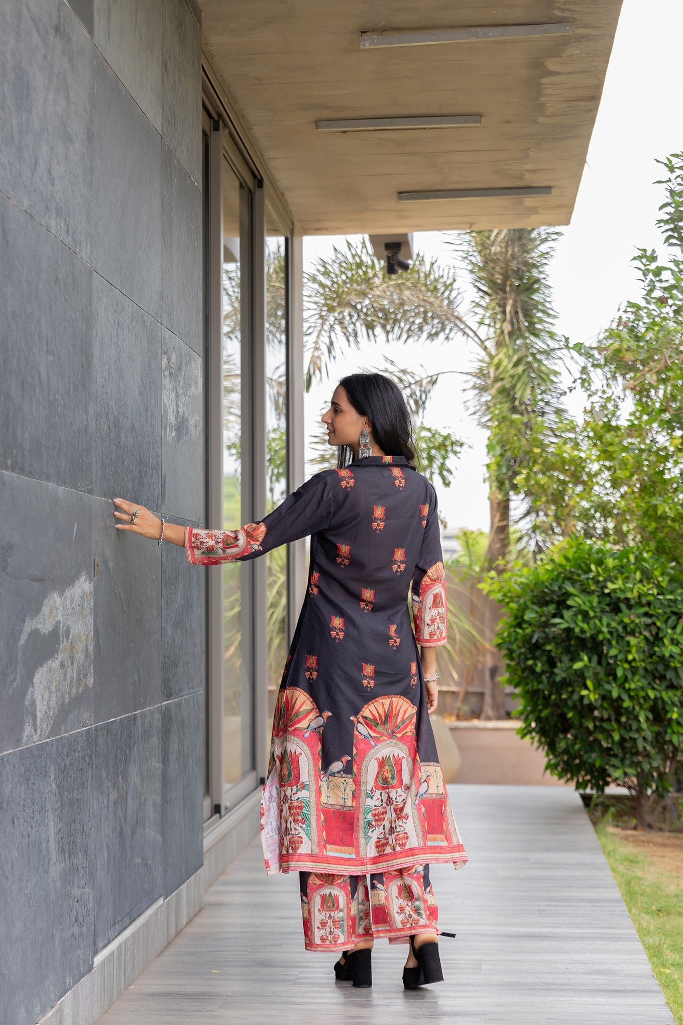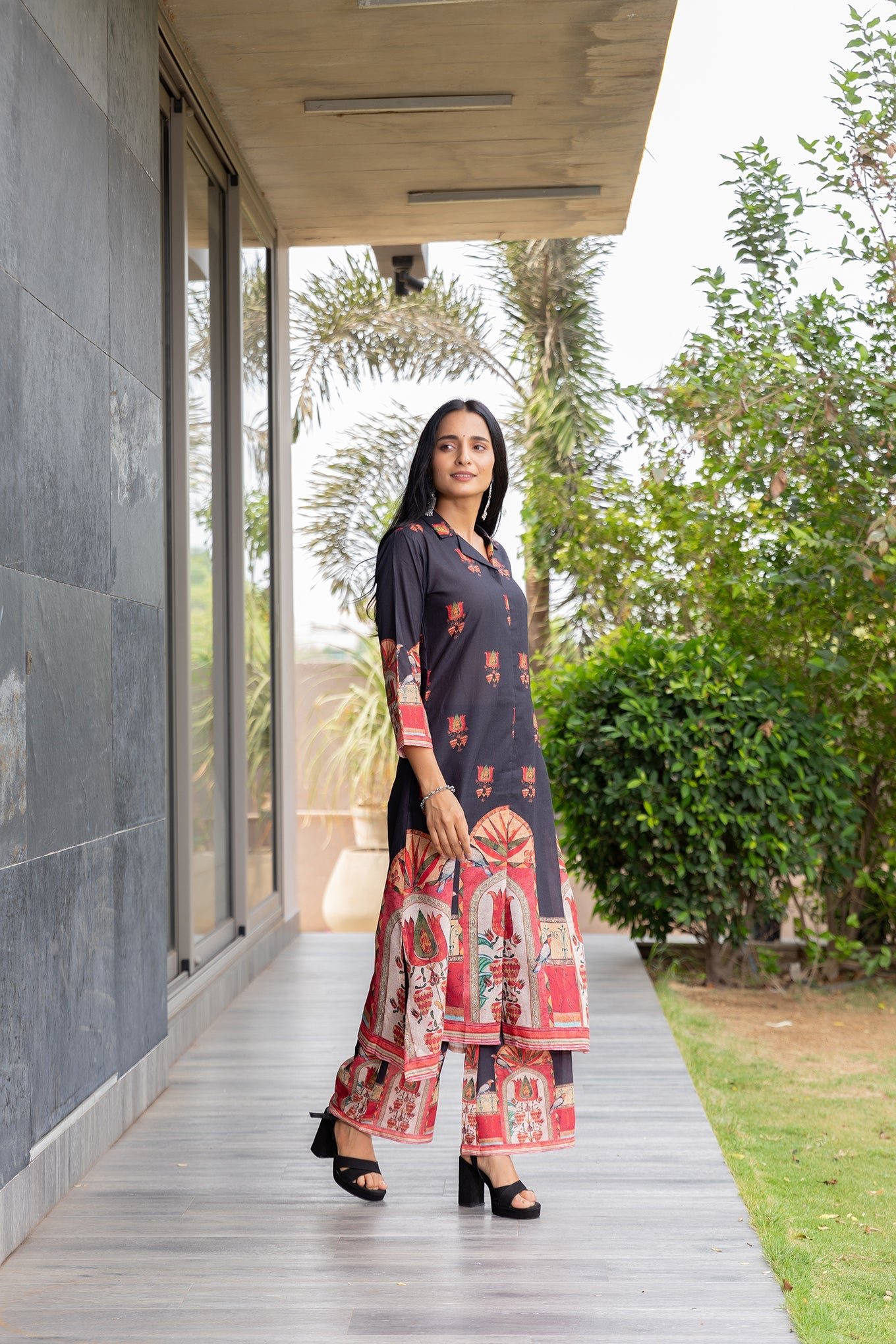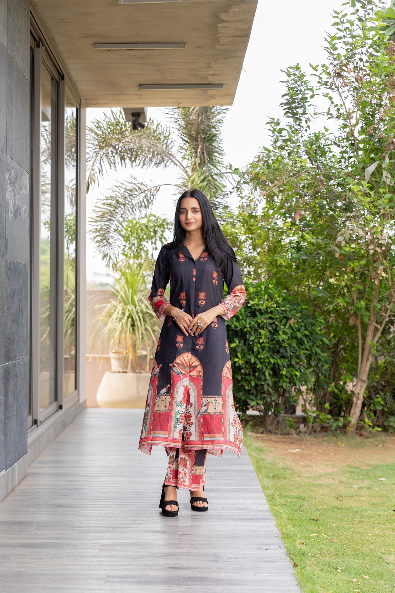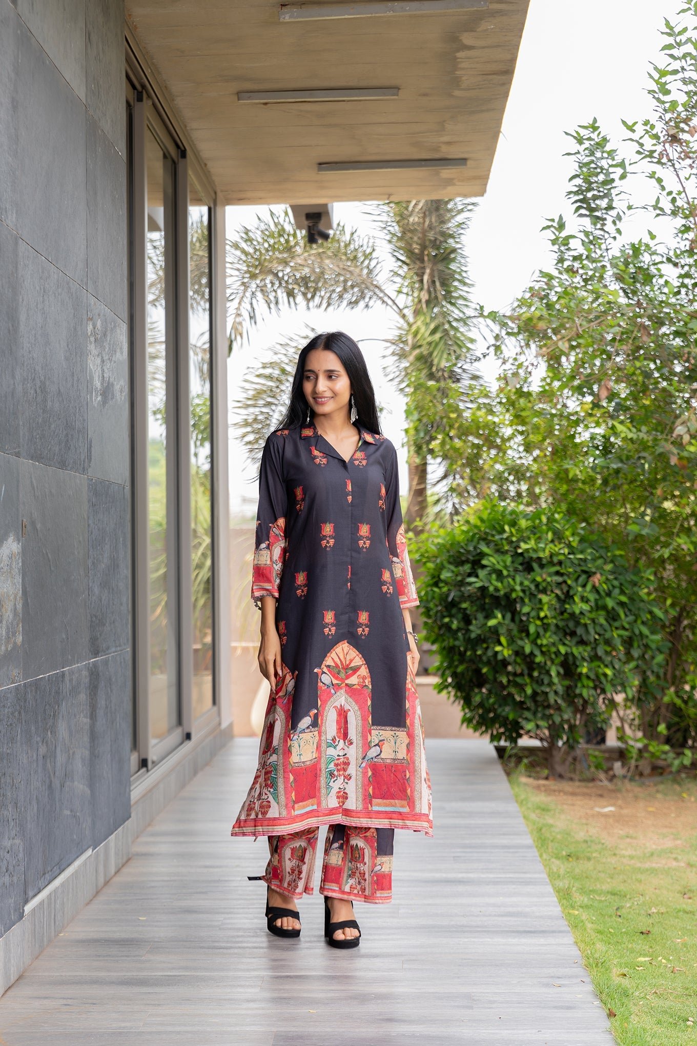 Elegant Black Bird V-Neck Kurta Set with Stylish Collar